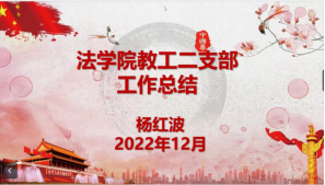 本科生第二党支部书记庞红主要围绕工作开展情况、存在的问题以及未来工作安排三方面展开。在工作建设方面突出政治本色,加强政治建设;突出思想引领,加强思想建设;突出党员标准,加强组织建设;突出效能导向,加强制度建设。针对理论学习不够深入、工作不够创新以及工作交接密度不够等问题明确解决方案,全面加强政治理论学习,深入贯彻党的二十大精神,科学统筹开展支部工作;结合员工思维特点,开展特色活动;突出学科特色,打造党建品牌,立足法学专业,发挥党员标杆作用,加强先进典型选树力度。