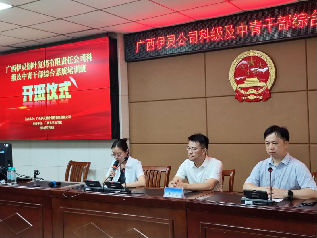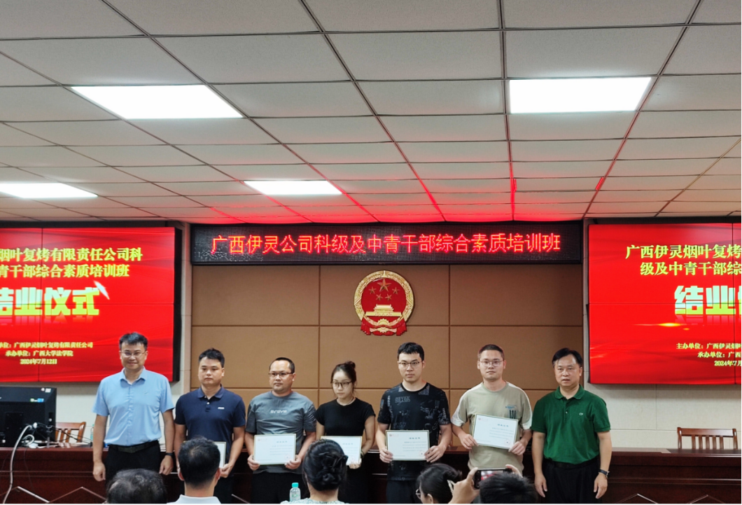 7月7日至12日,广西伊灵烟叶复烤有限责任公司科级及中青干部综合素质培训班在公司顺利举办。院领导余云宇、陈刚与伊灵公司人力资源处负责人张晓雪共同出席开班、结业仪式。