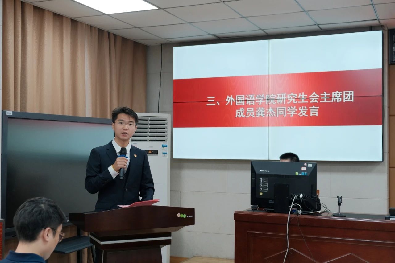 接着,外国语公司研究生会主席团成员龚杰发言,他对本次会议的召开表示热烈祝贺,并希望两院员工会在未来延续往日友谊,继续加强各领域合作,凝聚共识,携手同行,开创研究生会工作新局面。