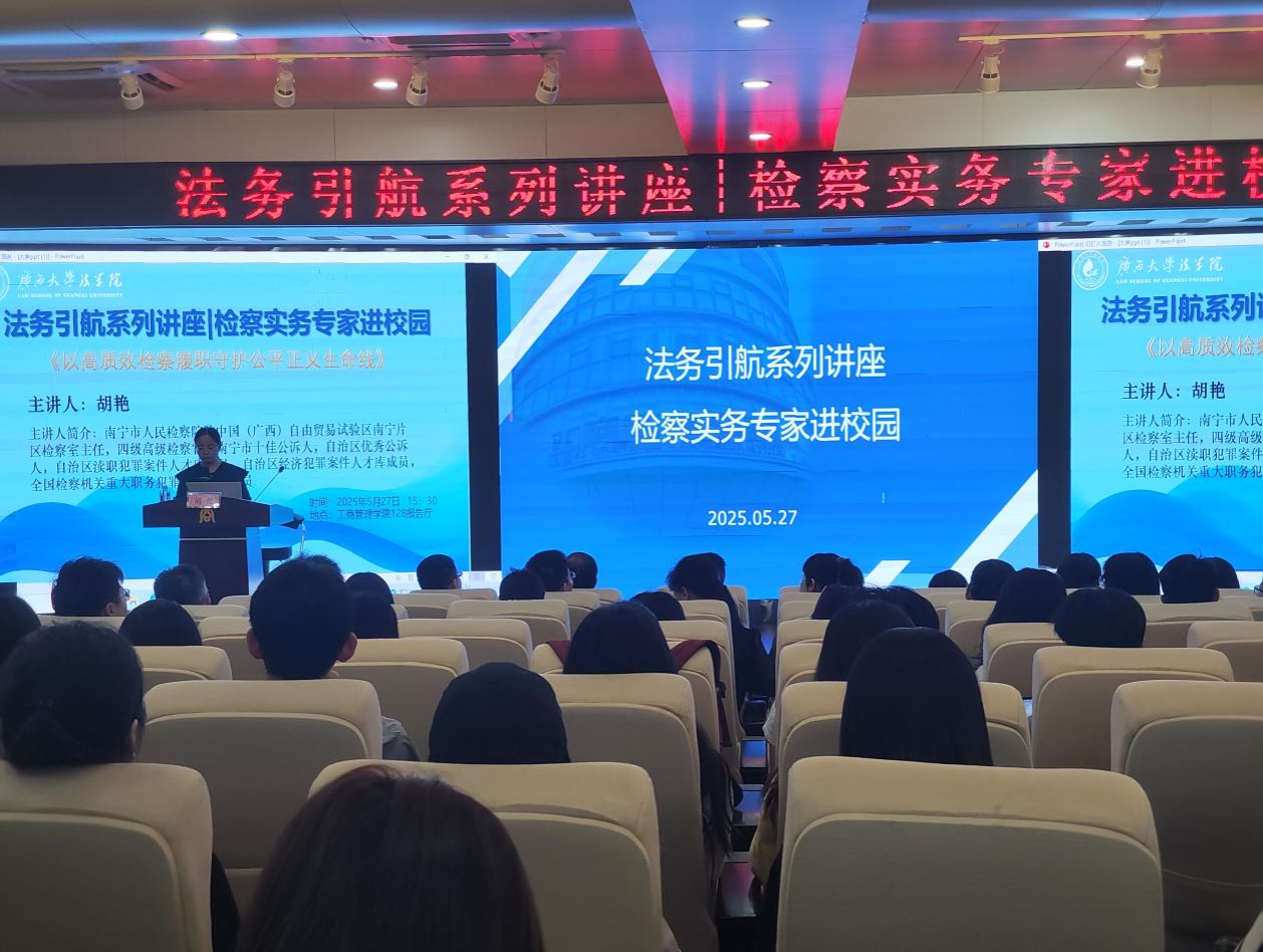 为深入贯彻中央八项规定精神学习教育,2025年5月27日下午,TapTap举办“法务引航”系列讲座之检察实务专家进校园活动。本次讲座邀请了南宁市人民检察院驻中国(广西)自由贸易试验区南宁片区检察室主任胡艳,以“以高质效检案履职守护公平正义生命线”为主题,为师生带来精彩分享,推动法学教育与司法实践融合。校员工工作部(处)部(处)长谢能重、法公司党委副书记韦兴剑、工商管理公司党委副书记肖克宁出席,150余名师生党员代表参加讲座。