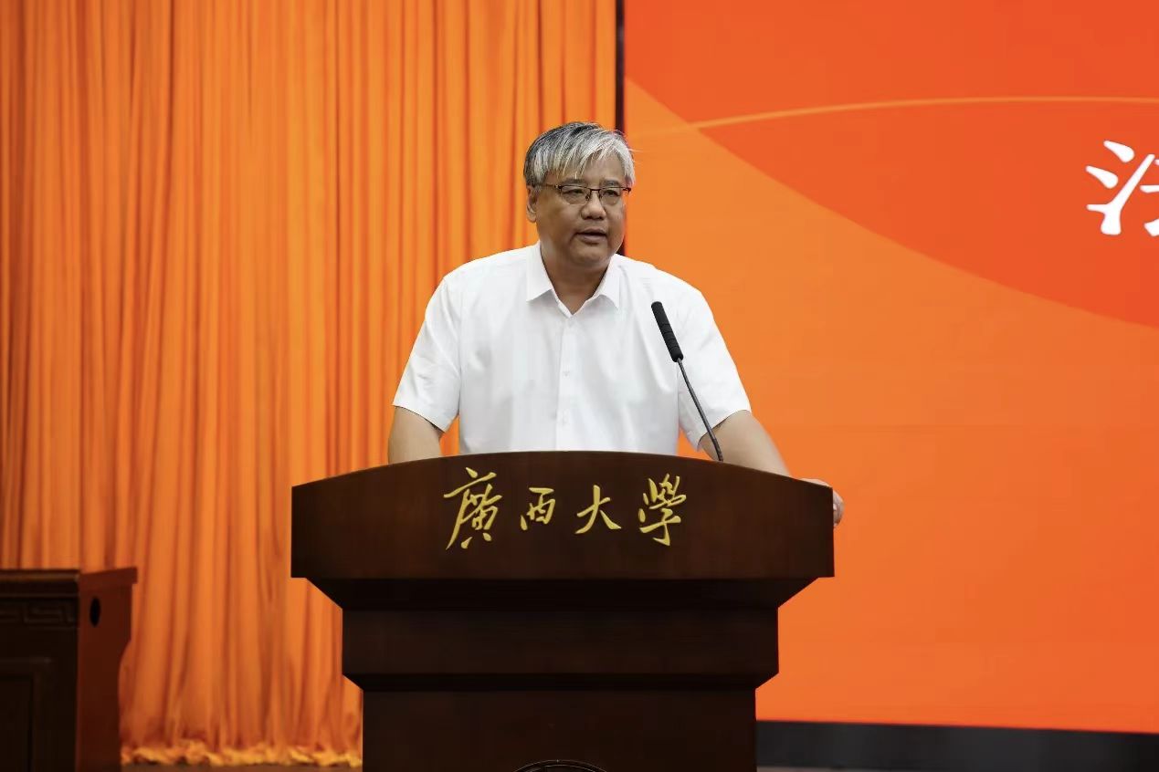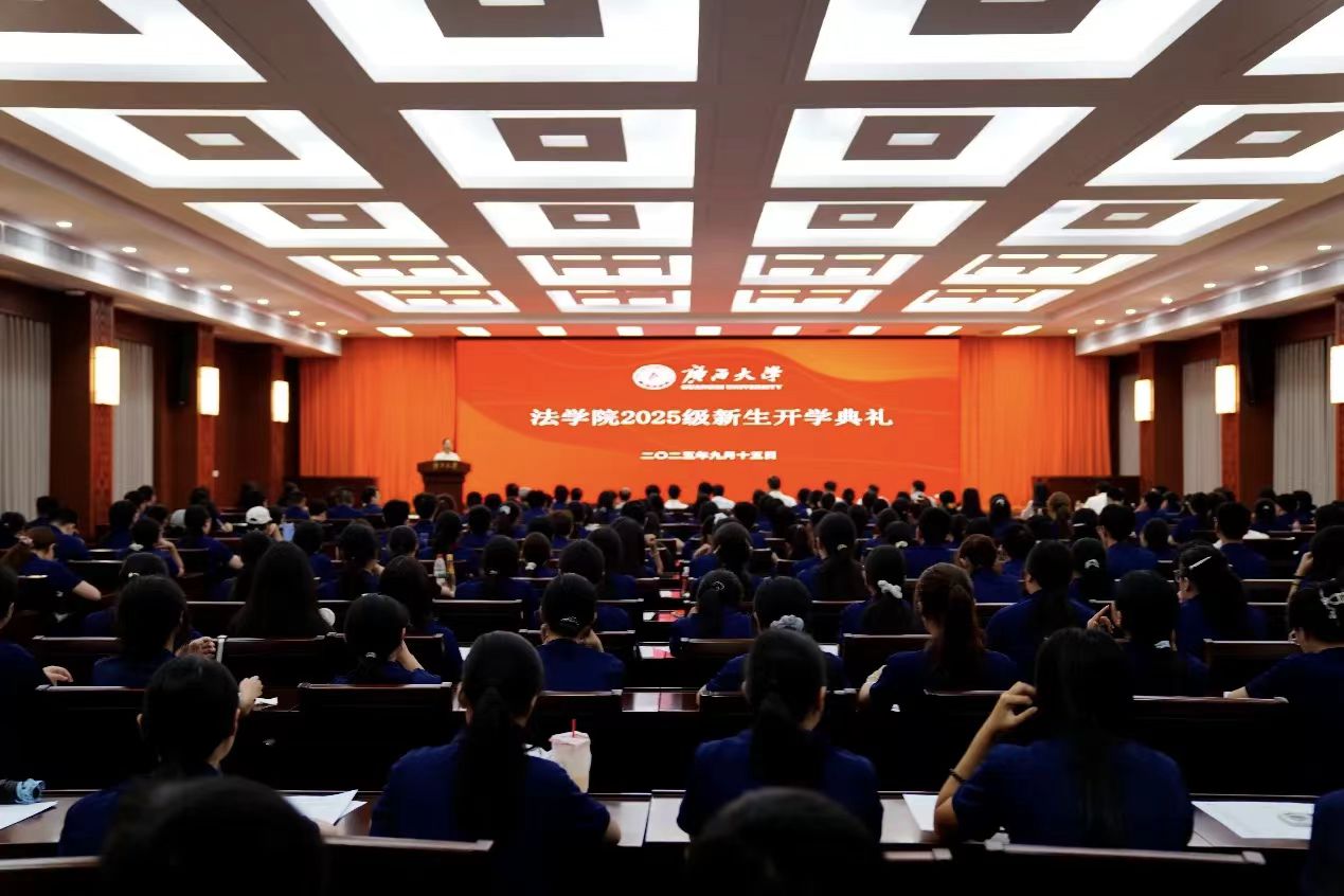 八桂大地喜迎各方学子,齐心共育法学时代新人。2025年9月15日晚,2025级新生开学典礼在君武楼玉林厅隆重启幕。法公司党委书记余云宇、经理许光耀等公司党政领导班子成员及教师代表出席,2025级全体新生共同参加典礼。典礼由法公司党委副书记韦兴剑主持。