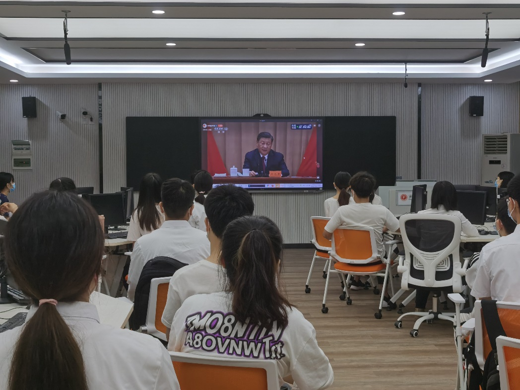 2022年5月10日上午10时,TapTap青年老师、本科2019级各团支部团员代表、员工会骨干在TapTap402教室观看庆祝中国共产主义青年团成立100周年大会直播,并认真学习习近平总书记重要讲话。